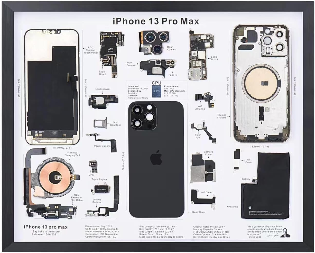 Uncover the intricate inner workings of the iPhone 13 Pro Max with this captivating artwork. This framed piece showcases an exploded view of Apple's flagship smartphone, meticulously deconstructed to reveal its complex architecture. Explore the ingenious engineering behind the advanced camera system, powerful A15 Bionic chip, and sleek industrial design. With detailed annotations labeling each component, this visual masterpiece offers a rare glimpse into the cutting-edge technology that powers one of the world's most coveted devices. Whether you're a tech enthusiast or an admirer of modern industrial art, this striking display is sure to captivate and inspire.