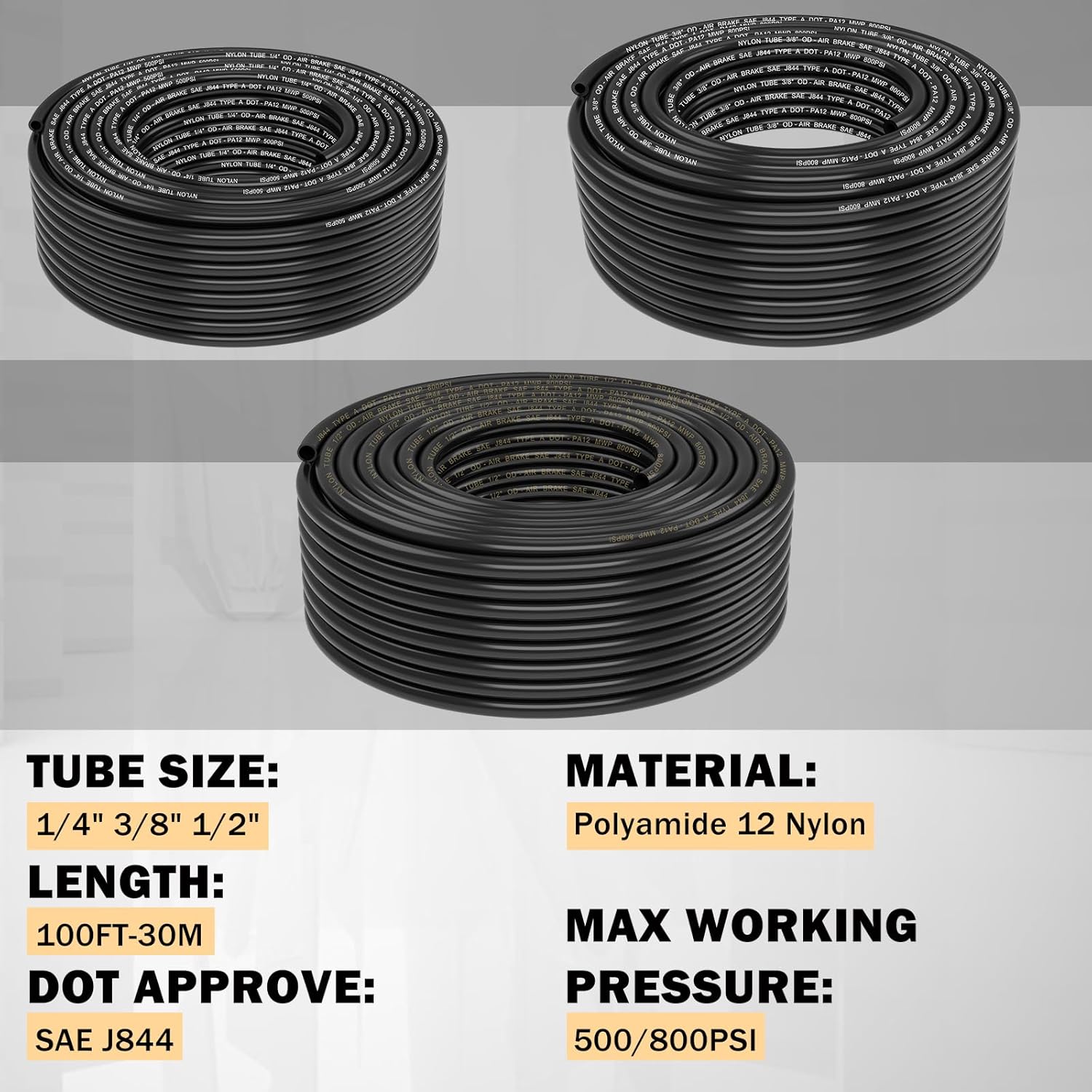 | Included Components | 100 FT 1/2" DOT AIR LINE, 100 FT 1/4" DOT AIR LINE, 100 FT 3/8" DOT AIR LINE, 106 PCS BRASS DOT AIR LINE FITTINGS, 3 PCS ACCESSORIES |