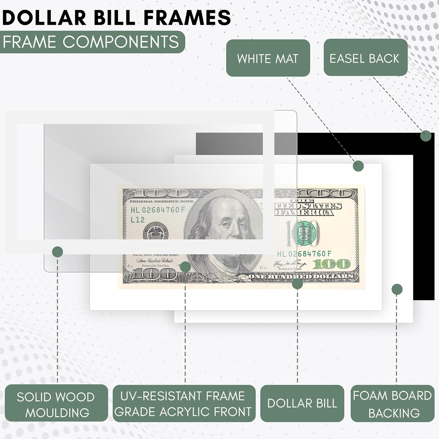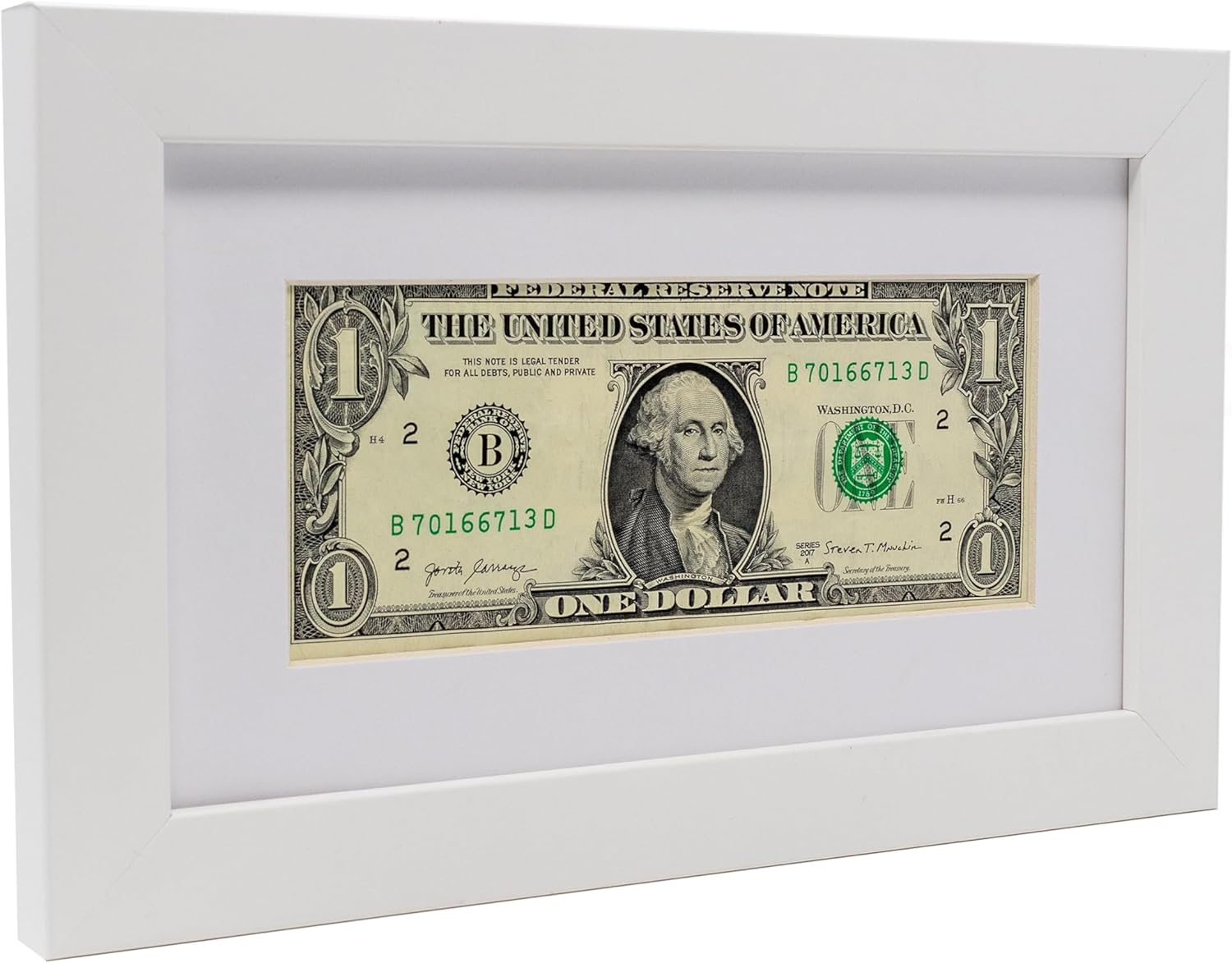 White solid wood frame to hold any US currency. Features a high-quality white real wood moulding, UV-resistant acrylic front, acid-free white matacid-free foam board backing and hanging hardware. Made to display 2.61” x 6.14” dollar bill with the white mat or 4.5" x 8" without the mat. Frame moulding is 0.75" wide and frame rabbet is 0.5" deep. The overall frame size is 6" x 9.5". Easel stand and wall hanging hardware are included with this frame for a versatile display. Hang your dollar bill frame on the wall or display on a tabletop. This dollar bill holder is ideal for beginners or experienced collectors, or business owners alike. It can be a thoughtful present or a useful addition to your personal collection or place of business. Our dollar bill frames are made in the USA. At Country Art House, we make, package and ship each frame with care. Satisfaction guaranteed!