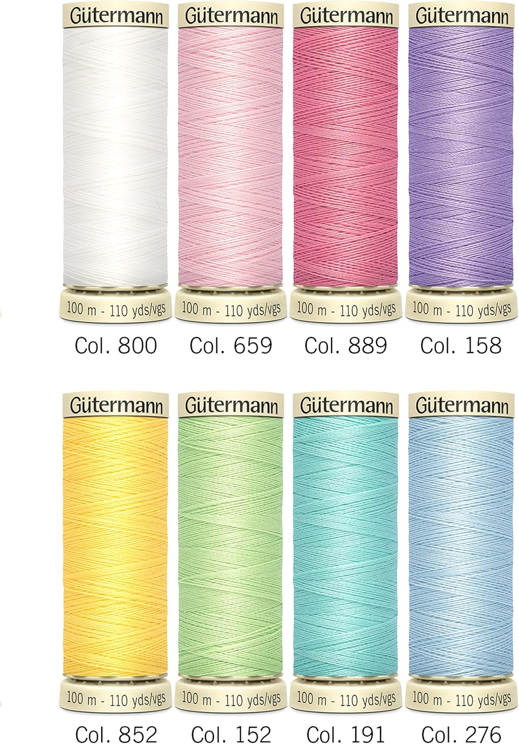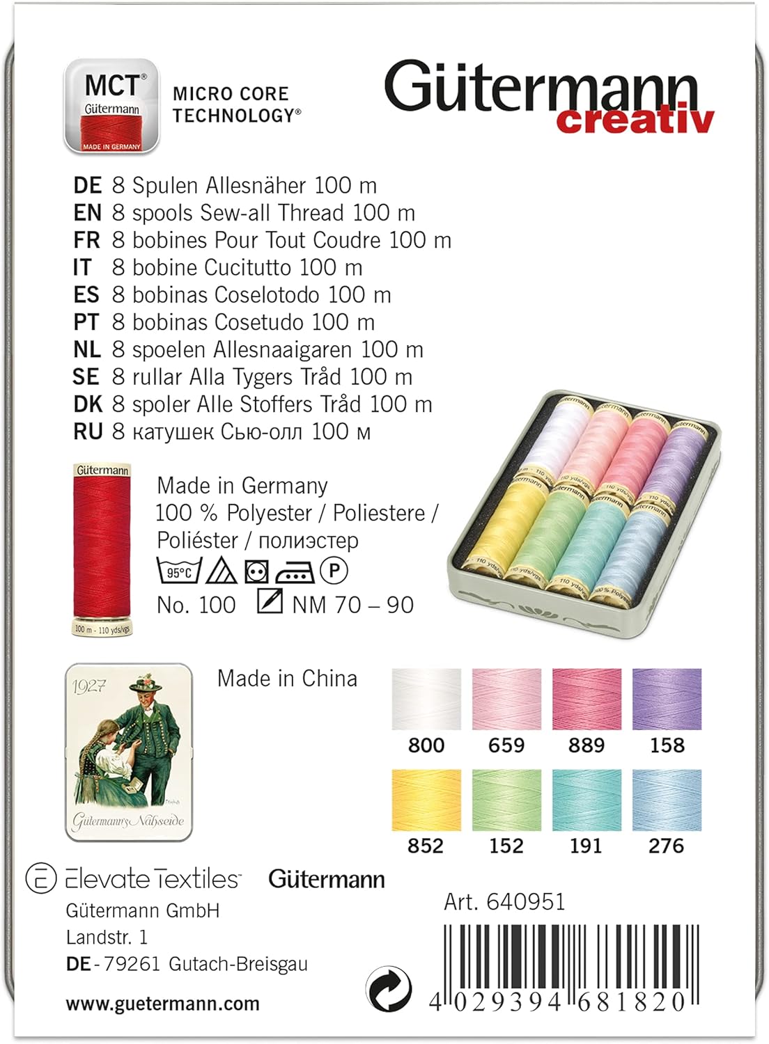 Gütermann’s Sew-all thread is unfathomably reliable, this thread suits both hand and machine sewing, all types of stitches, seams and fabrics. It is highly wear and tear resistant! Made from 100% polyester, it is washable up to 95°C and suitable for tumble drying. Recommended needle size: NM 70-90. Gütermann Sew-all thread is available in a wide range of colours with spools of several lengths. Made from tin, these boxes contain 8 different colours of Gütermanns Sew-all thread. Each spool holds 100m of thread. The box measures 92 x 128 x 22mm.