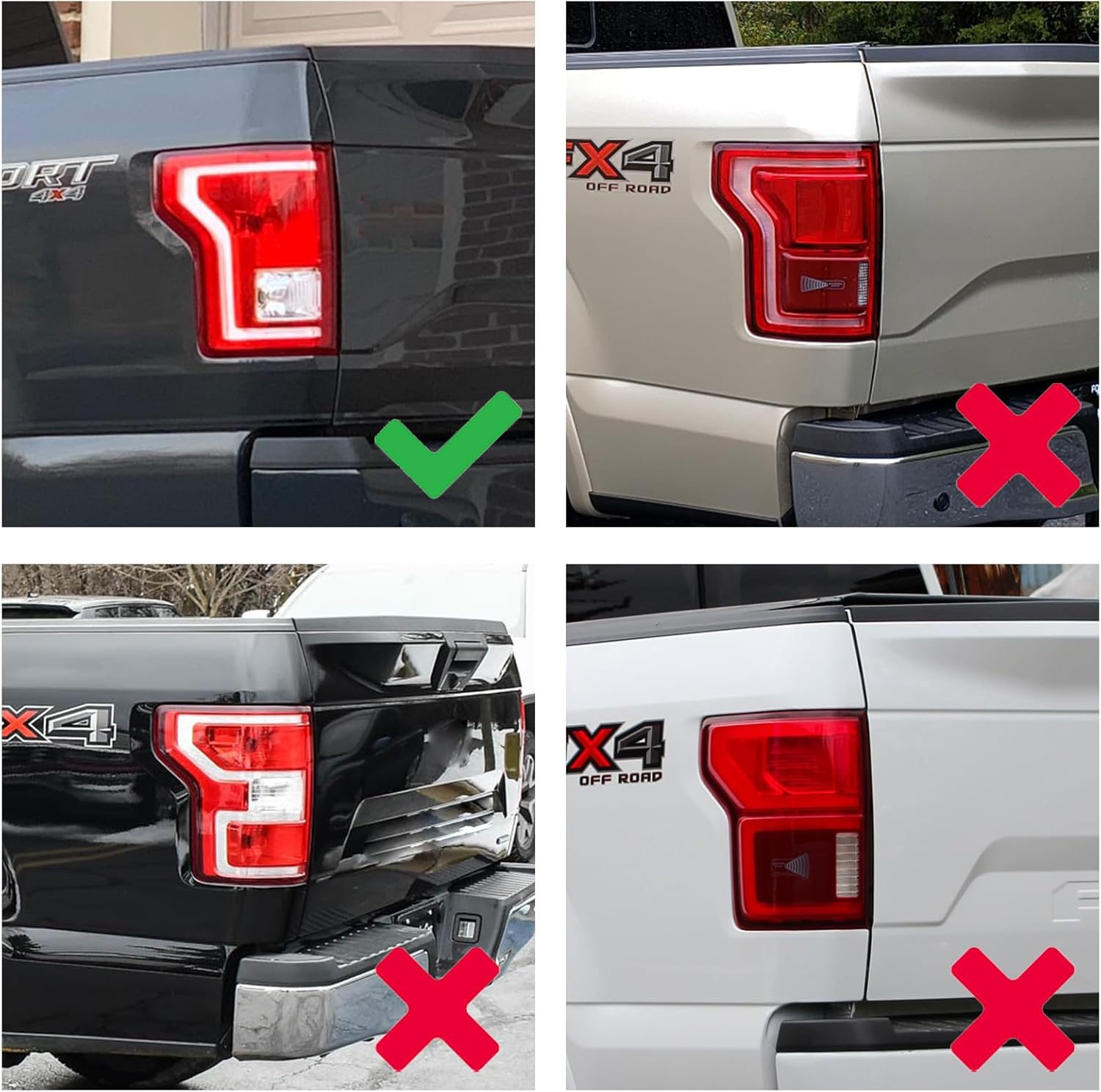 Perfect Fitment: Fit for 2015 2016 2017 Ford F150 XL & XLT, not fit for Lariat, King Ranch, Platinum, Limited, Raptor. Material: ABS. Package includes: 2Pcs Tail Light Cover. Installation instructions: 1. Please clean the installation place and keep it dry and no dust on. 2. Tear off the self-adhesive on the back. 3. If the temperature is below 15 degrees, you may need to Heating Product Tape.